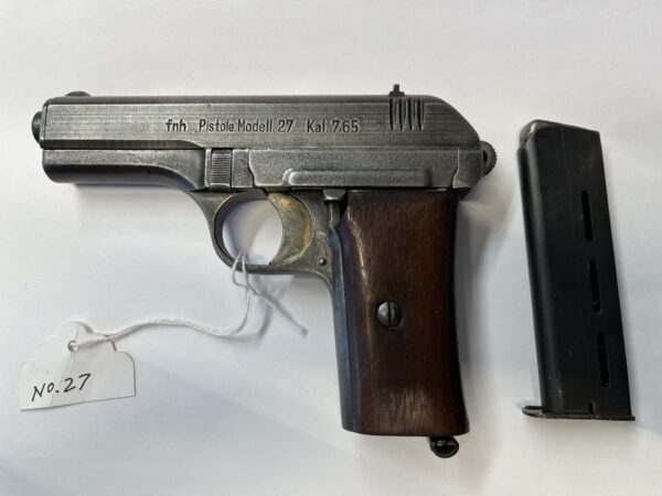 The M27 is a Czechoslovakian semi-automatic pistol, based on the pistole vz. 24, and chambered for 7.65 mm Browning/.32 ACP. It was designed by Frantisek Myska introduced in 1927 and continued in production until 1951 with almost 700,000 produced. It was manufactured by Česká Zbrojovka (Bohemian Arms Factory) of Strakonice, Czechoslovakia. Serial numbers for “fnh” CZ 27 pistols range from approximately 261,000 to 476,000.